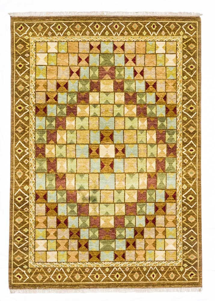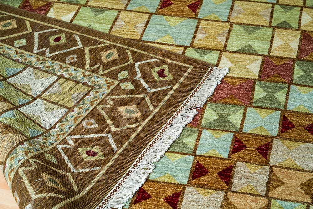 Shake your tail feathers and impress your visitors with the grace and elegance of this Afinus area hand-knotted rug. This uniquely colored Persian/Modern/Floral/Abstract/Geometric/Transition/Indian design is made with 100% pure wool and is hand-knotted by master craftsmen. The base of the rug with fringes showing is that of cotton yarn.